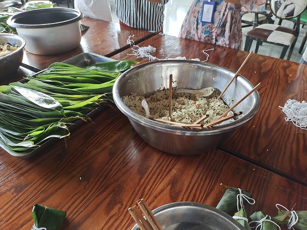 大家都聚精會(huì)神地忙活著手中的那捧“小舟”?!跋葘Ⅳ杖~錯(cuò)開交疊,折成漏斗形狀,米要放到這個(gè)位置……”。很多同事都被裹緊粽葉、系繩這一環(huán)節(jié)難住了,因?yàn)轸杖~裹不僅就會(huì)漏米,老同志們看到了這一幕,積極的向大家傳授包粽子的技巧。大家齊動(dòng)手,互學(xué)習(xí),不一會(huì)一個(gè)個(gè)長(zhǎng)粽、三角粽成型,看到自己的勞動(dòng)成果,大家既開心又滿足?;顒?dòng)現(xiàn)場(chǎng)歡聲笑語,空氣中粽葉飄香,透著濃濃的節(jié)日氣息。